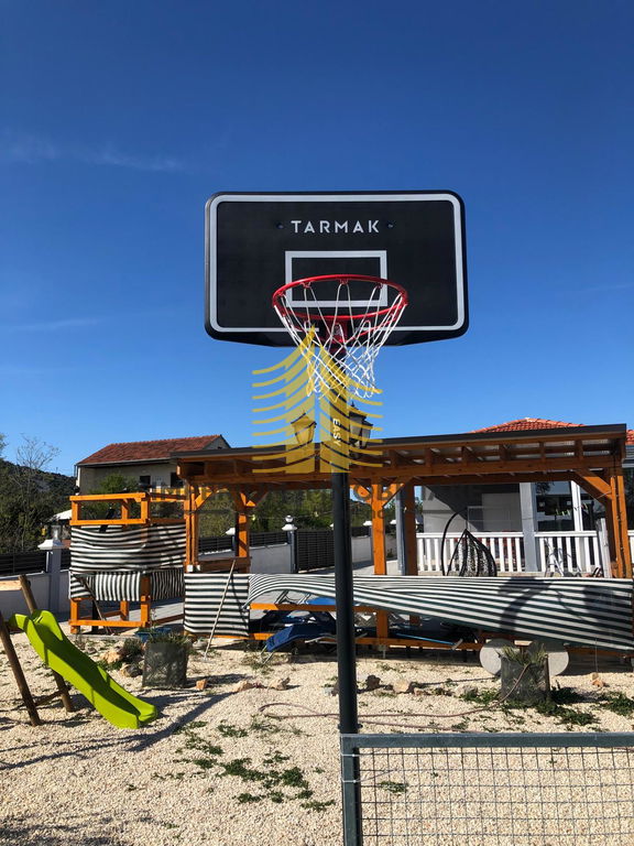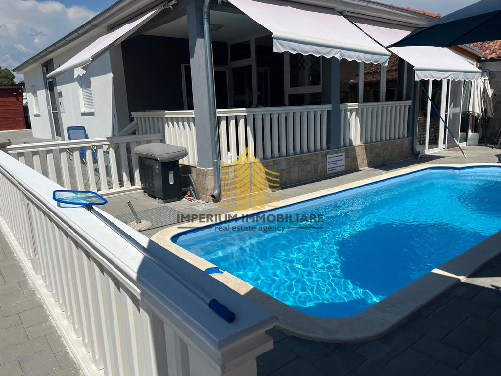 Kuća je opremljena klimom i kaminom, osiguravajući toplinu i ugodnu atmosferu tijekom cijele godine. Dodatne pogodnosti uključuju natkriveno parkiralište, balkon, lođu, dvorište te bazen i roštilj, idealno za opuštanje i zabavu. Sigurnost je zajamčena video nadzorom i alarmnim sustavom.