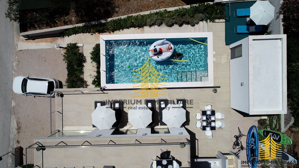 Vanjski prostor ove nekretnine očarava s predivnim bazenom dimenzija 8 x 4 metra, idealnim za osvježenje tijekom toplih ljetnih dana. Dva vanjska tuša pružaju dodatnu praktičnost. Na raspolaganju su i pet parkirnih mjesta, osiguravajući dovoljno prostora za goste, dok malena ostava pruža praktičan prostor za odlaganje stvari.