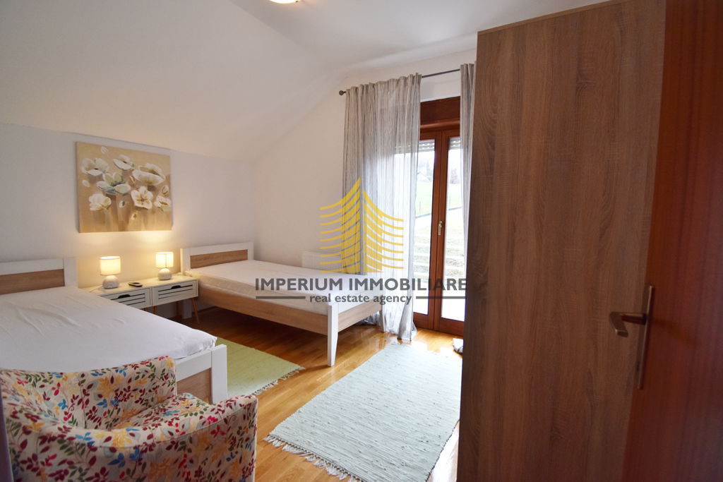Na prvom katu nalaze se poluotvoreni radni prostor, kupaonica s WC-om, te tri spavaće sobe od kojih dvije imaju izlaz na balkon.