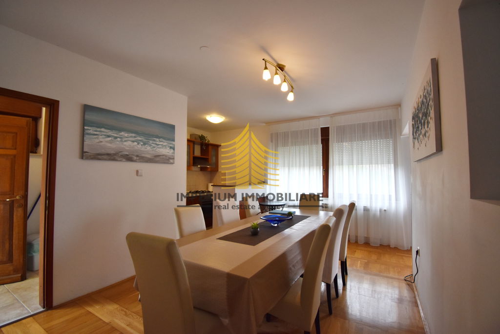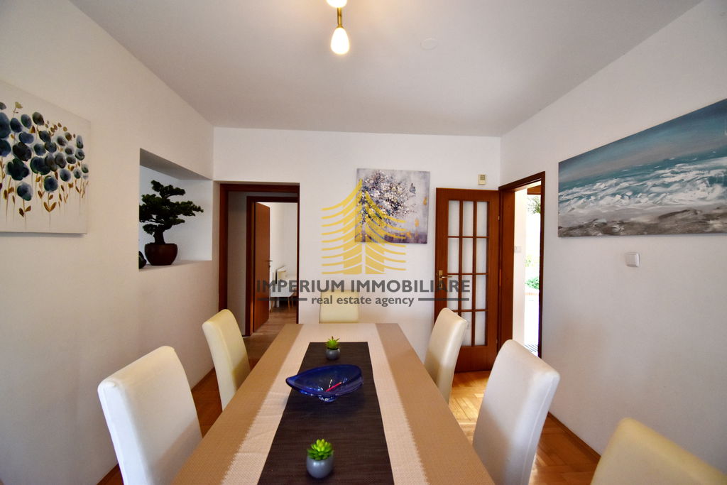 Prizemlje se sastoji od prostranog dnevnog boravka s izlaskom na terasu, potpuno opremljene kuhinje s blagovaonicom, jedne spavaće sobe, kupaonice s WC-om te dodatnog odvojenog WC-a. Pogled s terase krasi kombinacija prirodnog pejzaža i uređene okućnice. S ulice se direktno ulazi na vanjsko parkiralište, a dostupan je i pristup garaži.