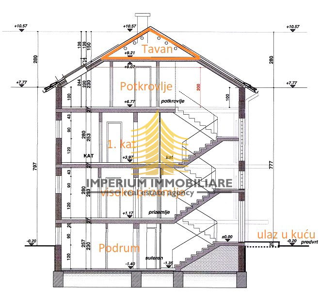 Broj i vrsta etaža: suteren s velikim vanjskim prozorima i puno dnevnog svjetla, prizemlje, kat i potkrovlje s bočnom nadozidom visine 1 m.