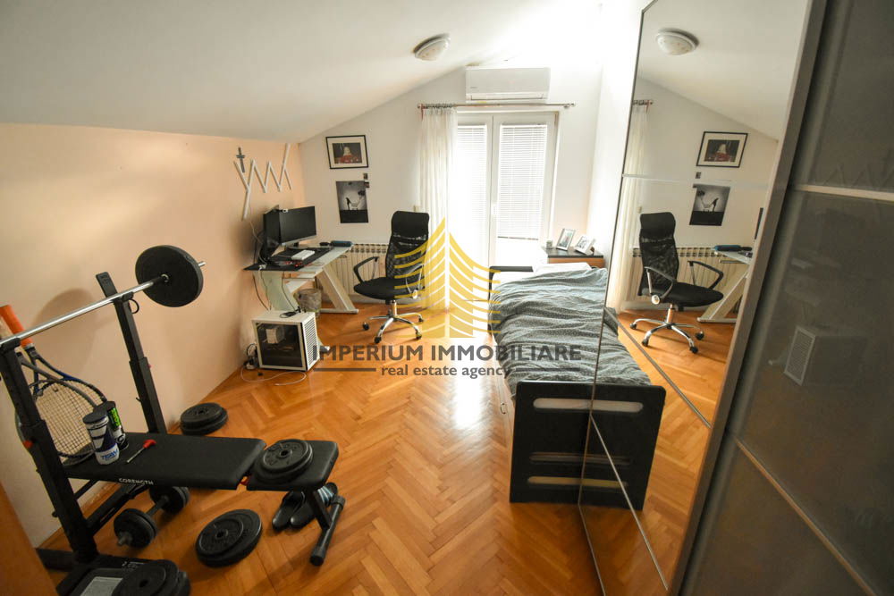 Kuća se ističe dodatnim sadržajima kao što su vrt, terasa, podrum, dvorište, ostava, garaža, protuprovalna vrata, alarm i video nadzor.
