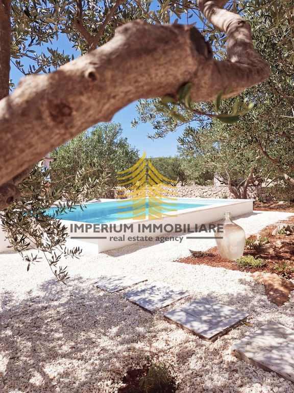 Posebna pažnja posvećena je vanjskom dijelu: natkrivena terasa s ljetnom kuhinjom i blagovaonskim prostorom idealna je za druženja na otvorenom. U središtu dvorišta nalazi se elegantan bazen okružen sunčalištem i zelenilom. Okućnica je oplemenjena maslinama, s dovoljno mjesta za dodatne sadržaje po želji.