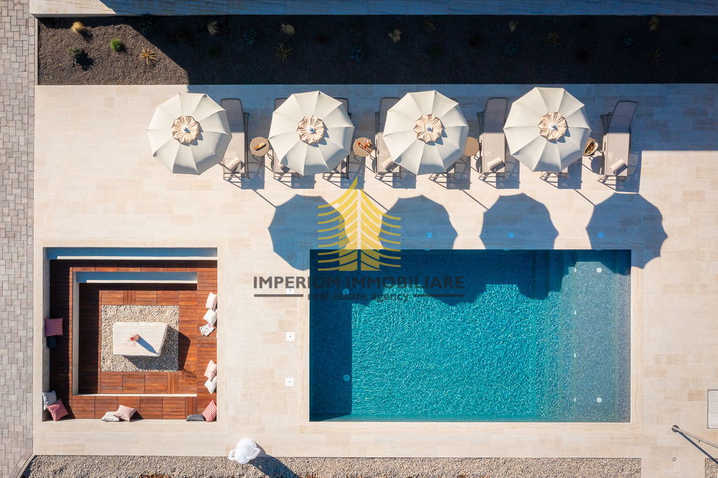 ️ Bazen od 45 m2 s dizalicom topline i posebnom tamnom keramikom, okružen sunčalištem i terasom od 250 m2 travertin kamena.