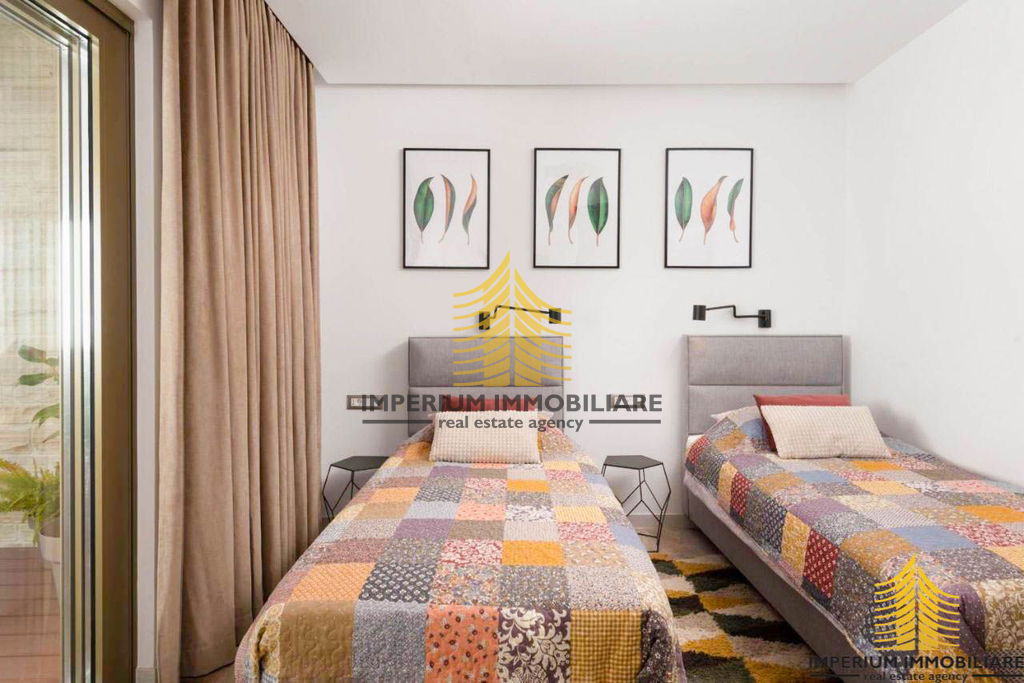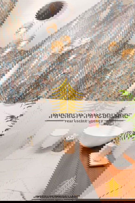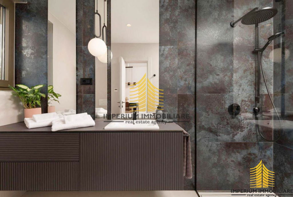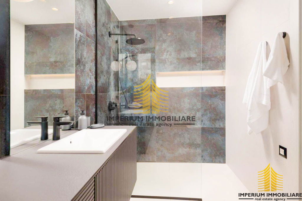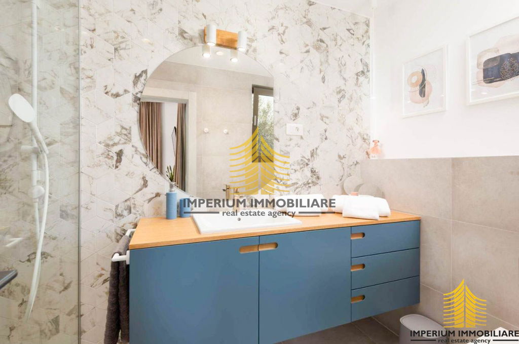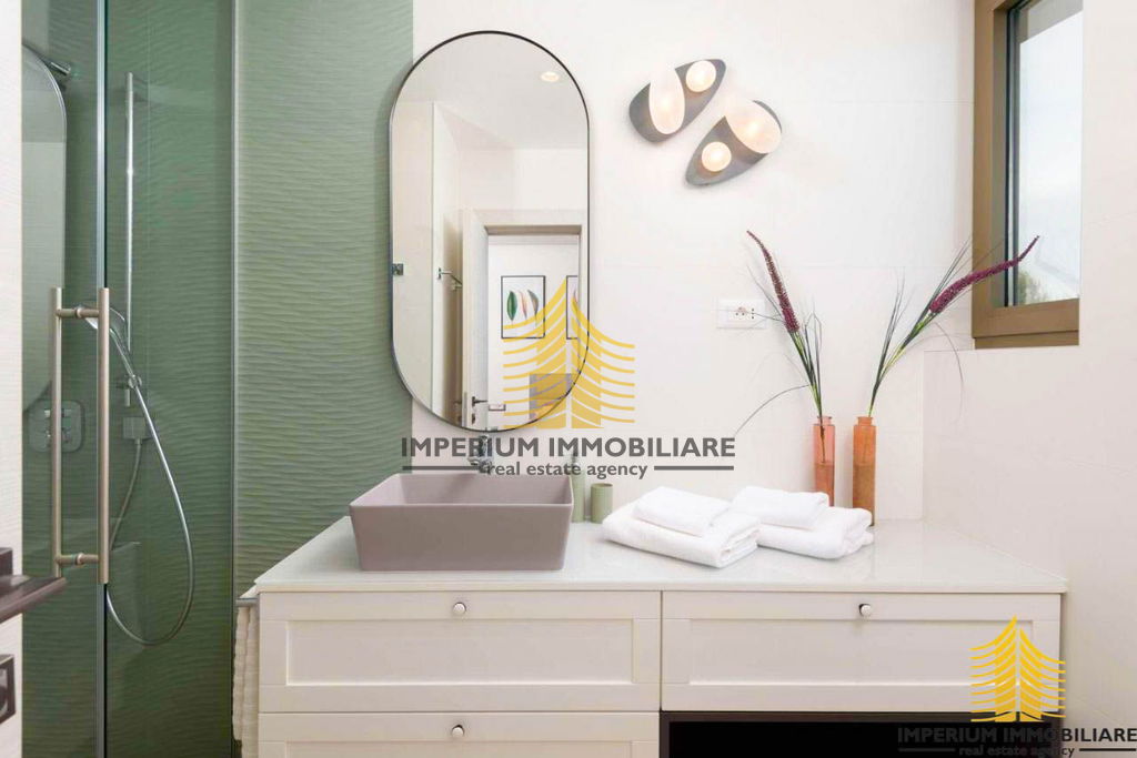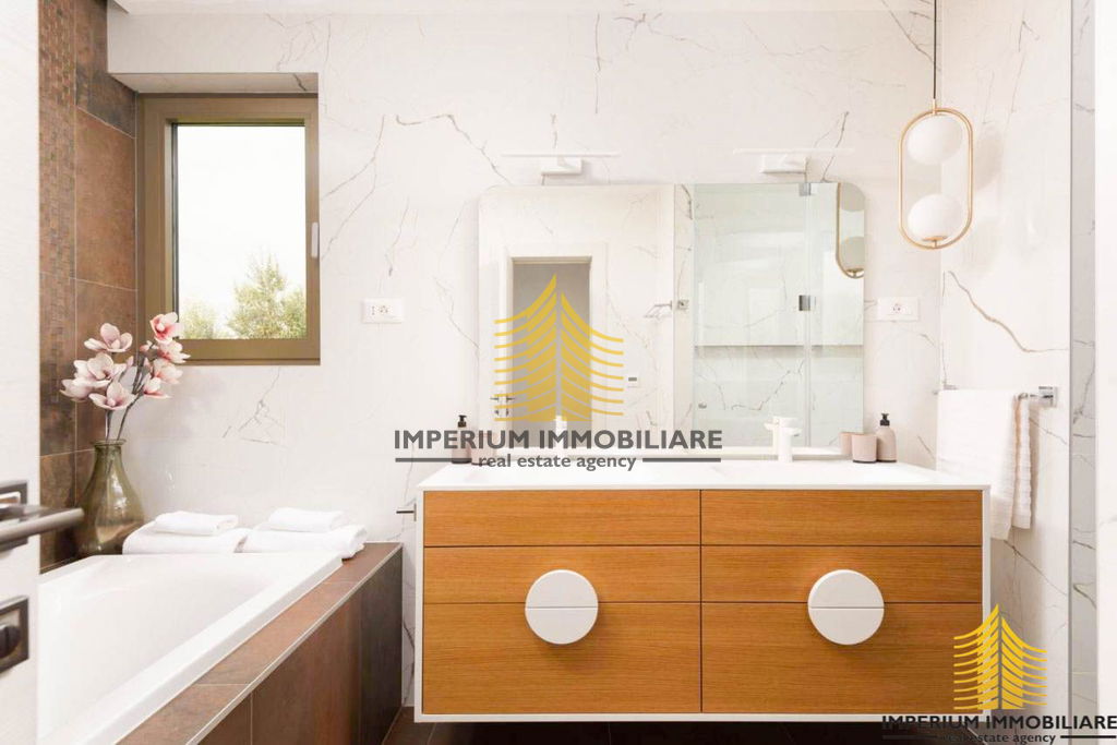 Sve kupaonice opremljene su walk-in tuševima, dok glavna spavaća soba dodatno nudi i kadu. Velika vanjska terasa obuhvaća bazen dimenzija 11x5m, jacuzzi, prostor za igru i zabavu te vanjski tuš. U neposrednoj blizini nalazi se i vrtna kućica površine 41m2, opremljena spavaćom sobom s kupaonicom, prostorom za roštilj i dodatnim WC-om.