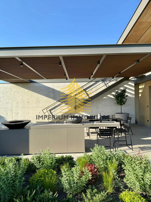 Posebnosti ove nekretnine uključuju balkon, zatvoreni balkon, lođu i prostranu terasu, što omogućuje više prostora za opuštanje i druženje na otvorenom. Uređena okućnica s vrtom pruža dodatnu vrijednost, dok bazen i fitnes prostor unutar objekta nude mogućnost rekreacije i relaksacije u vlastitom domu. Garaža je dostupna za sigurno parkiranje vozila, a dodatna sigurnost osigurana je alarmnim sustavom i video nadzorom. Kuća je opremljena smart home sustavom koji olakšava upravljanje raznim funkcijama.
