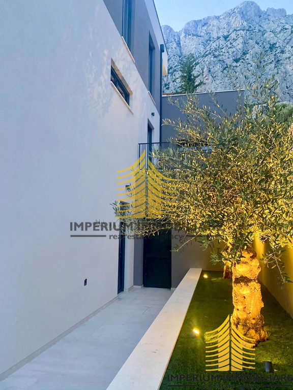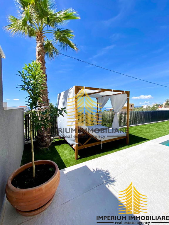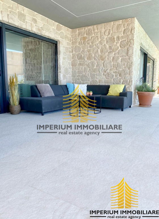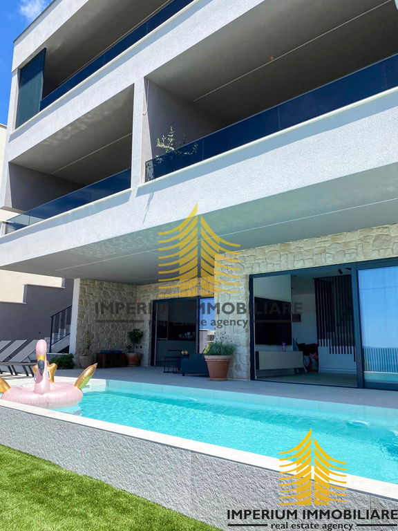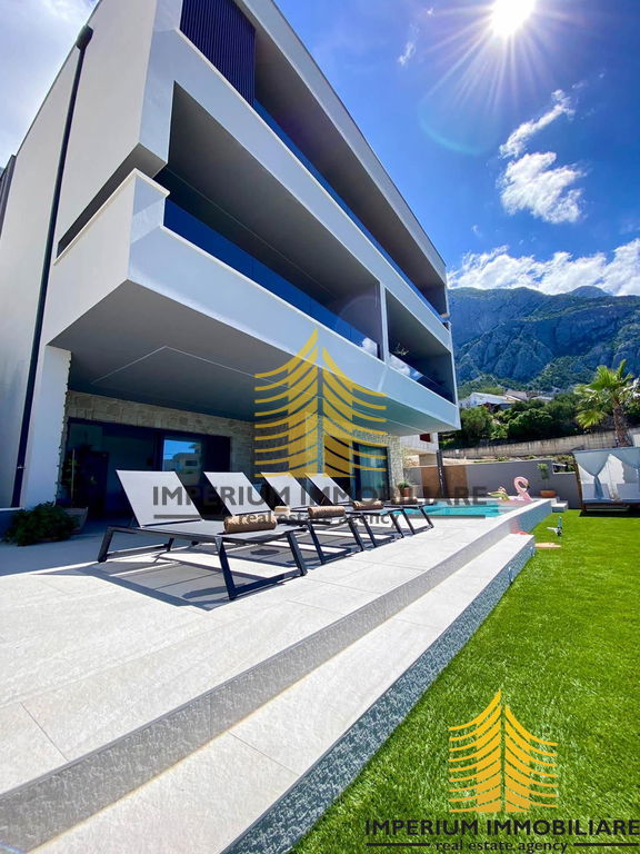 Prizemlje + polovica prvog kata: Četverosobni stan s tri kupaonice, prostranim dnevnim boravkom, kuhinjom i hodnikom. Stan ima privatno dvorište s bazenom i dva balkona ukupne površine 30 m2. Ovaj stan trenutno je u funkciji iznajmljivanja, ostvarujući izvrsne prihode pod nazivom Villa 5".