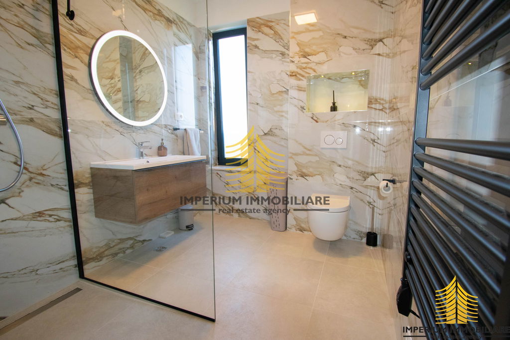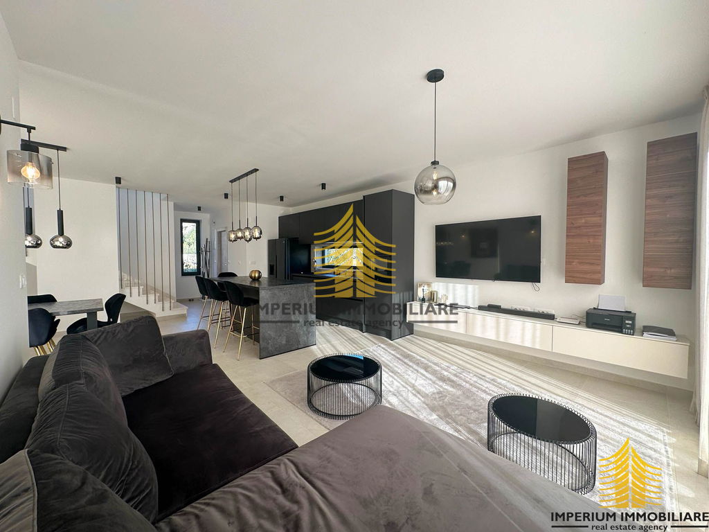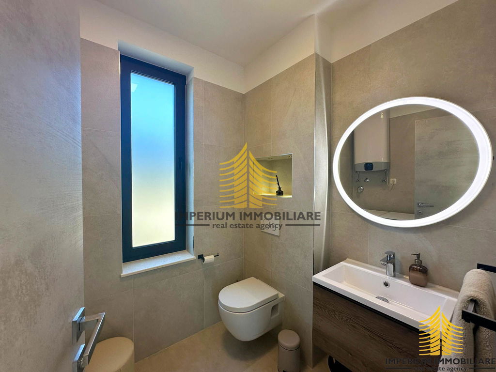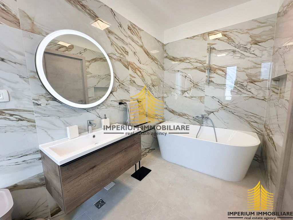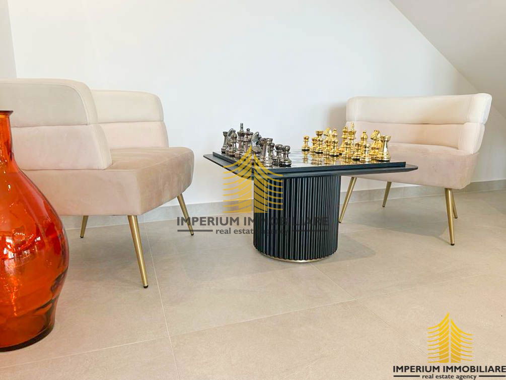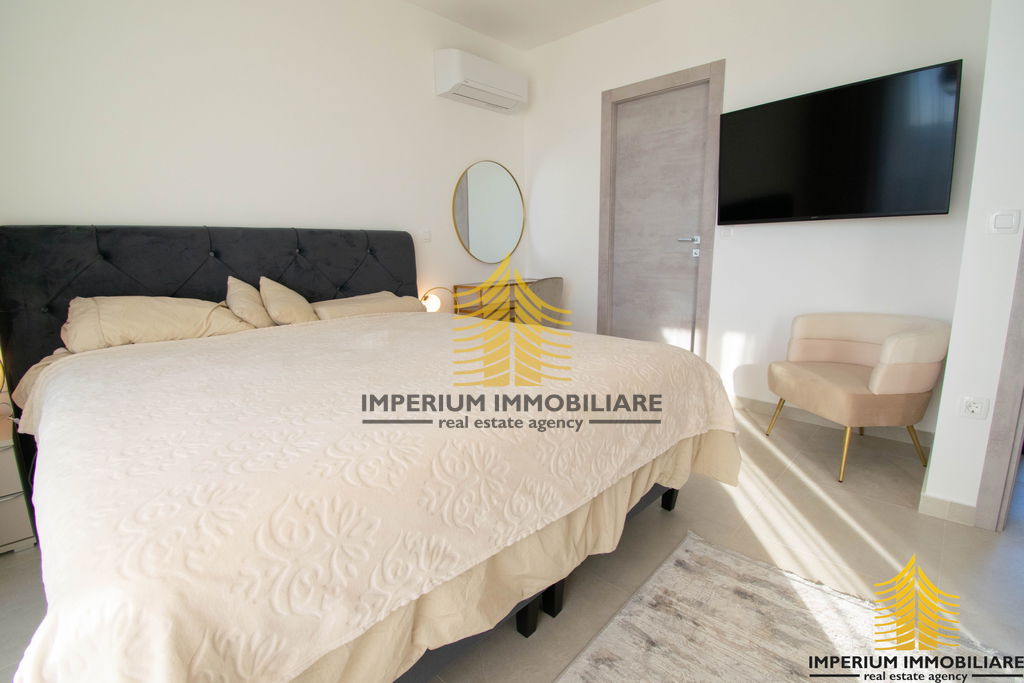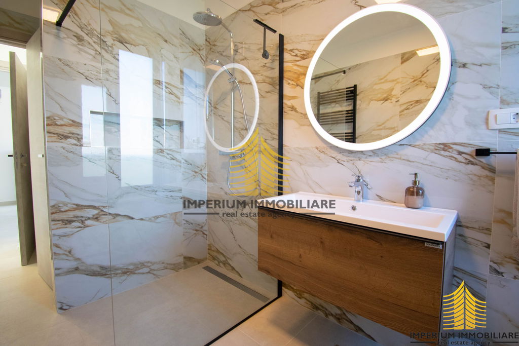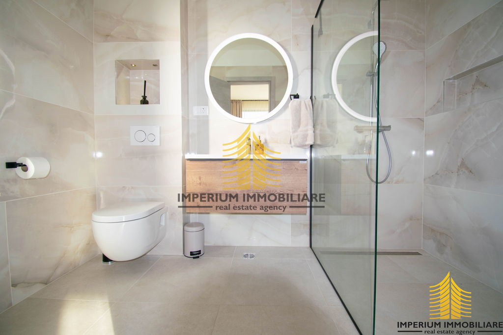 Sastoji se od tri master room-a spavaće sobe, ima tri kupaone i dodatni pripadajući WC, blagovaonicu, dnevni borak i velike prostrane moderne kuhinje. Također ima i pripadajuće spremište.