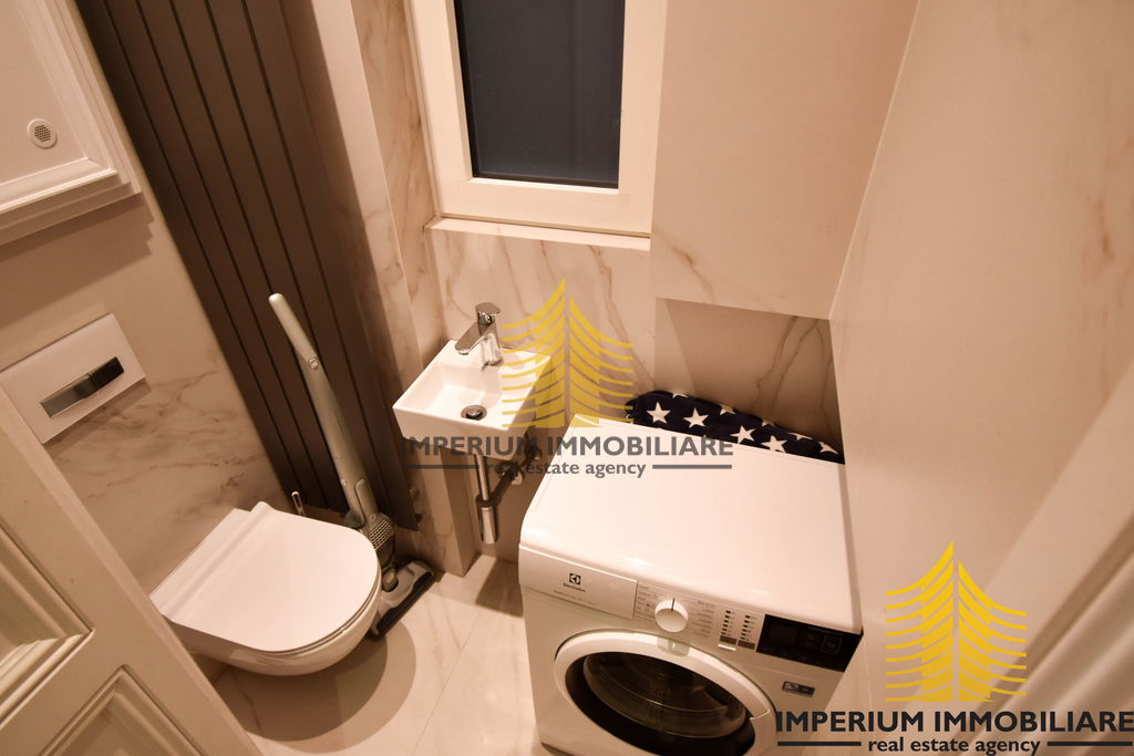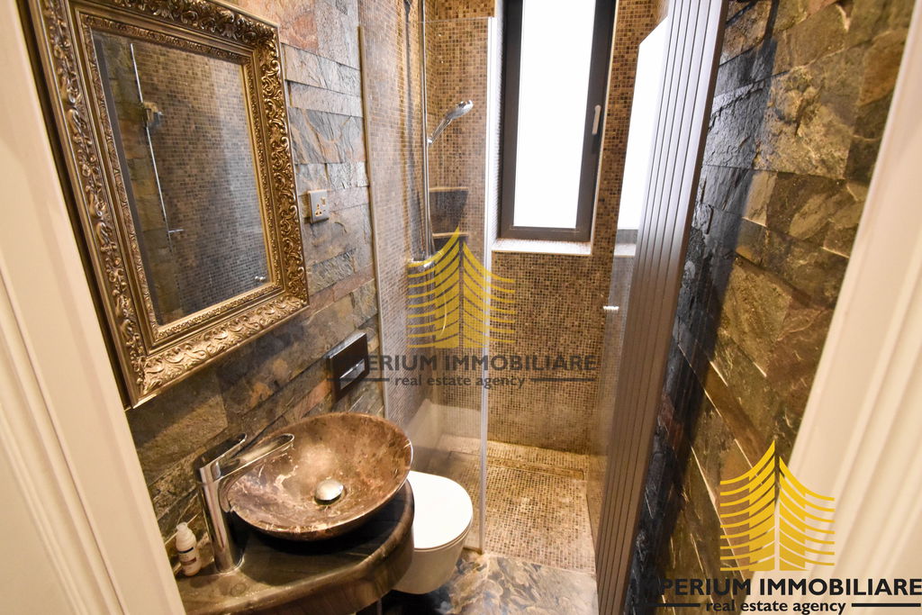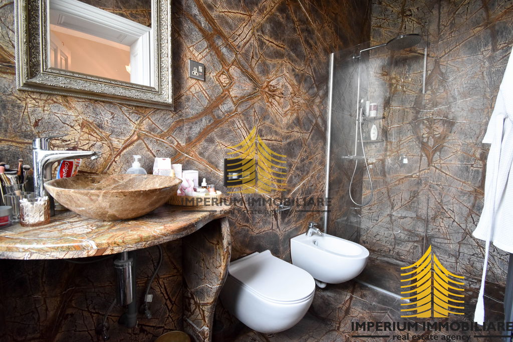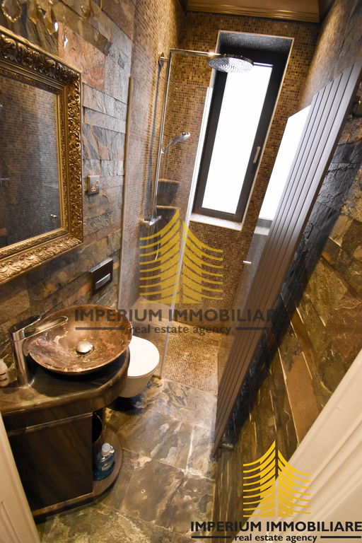 Kupaonice su obložene visokokvalitetnim kamenom u bookmatch tehnici, što pruža prirodan izgled.