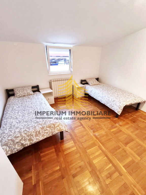 Iznajmljuje se potpuno opremljena kuća površine 160 m2, podijeljena na dvije etaže s ukupno 6 soba i kapacitetom za 13 osoba. Sastoji se od dvije stambene jedinice: