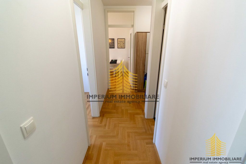 Stan se sastoji od dvije spavaće sobe, što ga čini idealnim za obitelji, parove ili pojedince koji traže dodatni prostor. Posebnost čini lođa, savršena za opuštanje ili uživanje u svježem zraku. Uz protuprovalna vrata i dizalo, sigurnost i pristupačnost su osigurani.