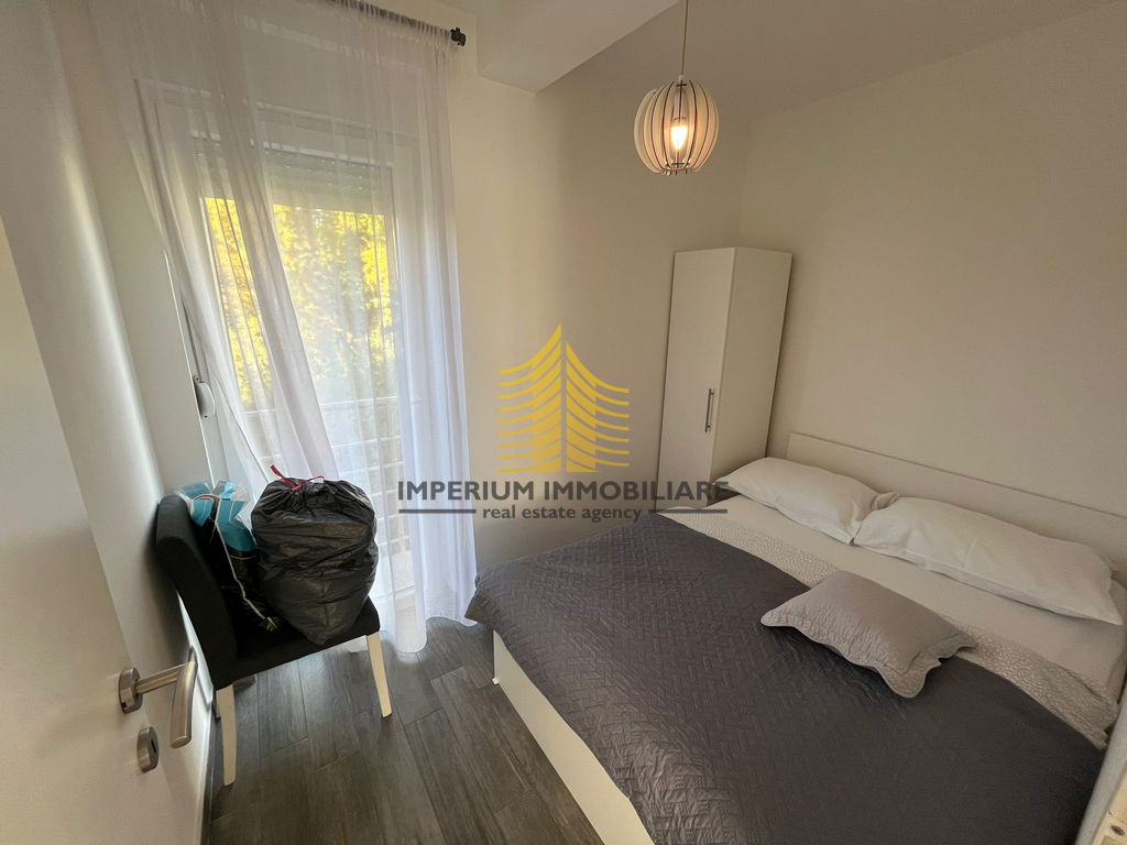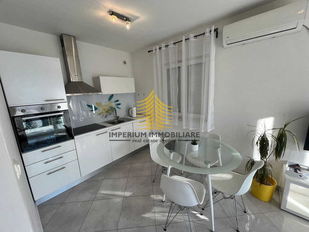 Unutarnji prostor opremljen je kuhinjom s aparatima, perilicom posuđa, perilicom rublja, TV-om te krevetom. Klimatizacija osigurava optimalnu temperaturu tijekom cijele godine. Posebnu vrijednost ovom stanu daju luksuzne značajke poput vrlo sunčane pozicije, uređene okućnice, umjetničkog i dizajnerskog uređenja te prostora za roštilj.