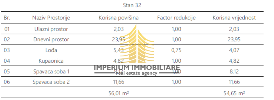 Prostorno, stan se sastoji od dvije spavaće sobe i dnevnog boravka, a orijentiran je prema sjeveru. Posebnu vrijednost daje lođa, koja omogućuje dodatni prostor za opuštanje i uživanje u privatnosti.