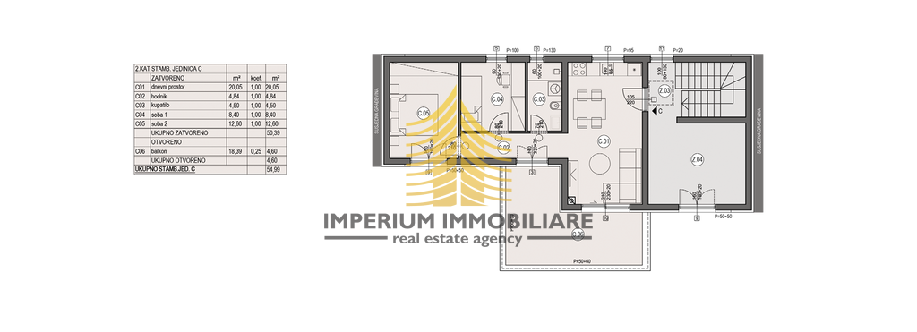 Raspored stana obuhvaća dvije spavaće sobe te dodatni dnevni boravak, što ga čini idealnim rješenjem za obitelji, parove ili pojedince koji traže funkcionalan i ugodan životni prostor. Orijentacija stana prema sjeveroistoku pruža prirodnu svjetlost tijekom dana, stvarajući ugodnu atmosferu.