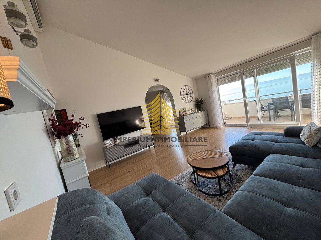 Stan se odlikuje jugom orijentacijom, što mu omogućuje obilje prirodne svjetlosti tijekom cijelog dana, stvarajući vrlo sunčan i ugodan ambijent. Prostorije su pažljivo osmišljene kako bi pružile funkcionalnost i estetiku, uz poseban naglasak na dizajnerski i umjetnički dojam. Iz stana se pruža lijep pogled na more, dodatno naglašavajući ekskluzivitet i atraktivnost nekretnine.