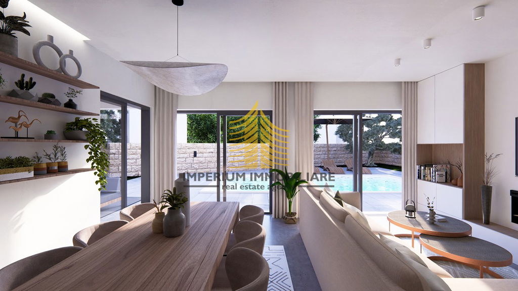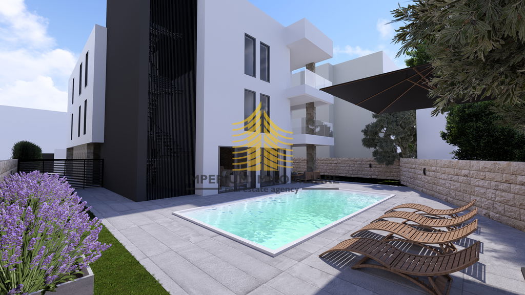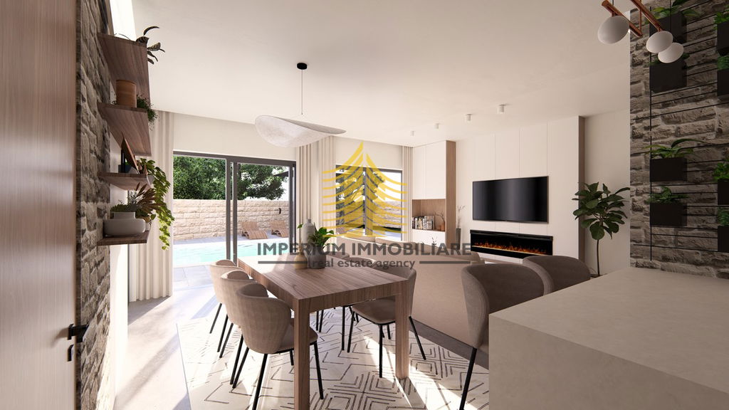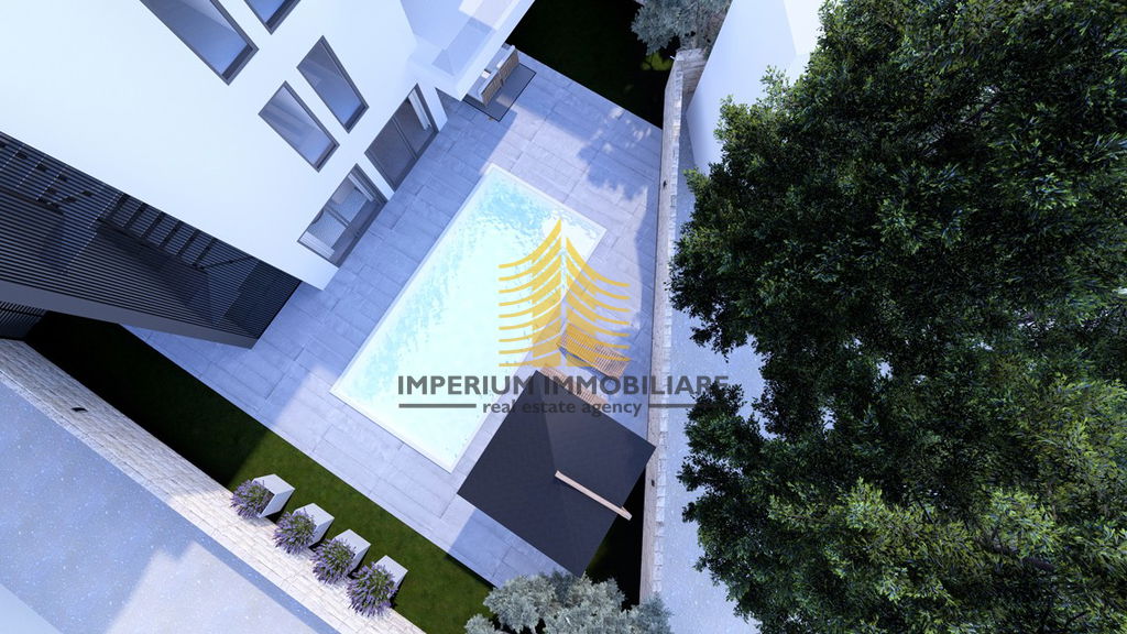 Stan u prizemlju imat će privatni vanjski bazen veličine 7,6 × 4 m u velikom privatnom vrtu. Krasit će ga velike staklene stijene koje, osim što daju stanu obilje dnevnog svjetla, omogućavaju pogled na bazen iz velikog dnevnog otvorenog prostora. Dvije sobe bit će uređene kao spavaće sobe s ugradbenim garderobnim ormarima i bračnim krevetima. Dnevni prostor uključuje L-kuhinju sa šankom i svim potrebnim aparatima, prostor za blagovanje sa stolom i 6 stolica te veliku sjedeću garnituru ispred koje se nalaze kamin i veliki TV ravnog zaslona. Elegantna kupaonica sadržavat će tuš kabinu te vertikalno postavljene perilicu i sušilicu rublja. Svi stanovi bit će uređeni s parketima i keramikom prve klase.